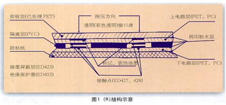 (R) 結(jié)構(gòu)薄膜開關(guān)是由面板層 隔離層 電路層組成 它們選用了PET,PC,PVC等各種不同性質(zhì)的軟性薄膜 就是在這些片材上通過網(wǎng)版印刷在面板上印刷彩色指示性油墨 在電路層上印刷導電線路和絕緣油墨等 再進行組合就成了薄膜開關(guān).